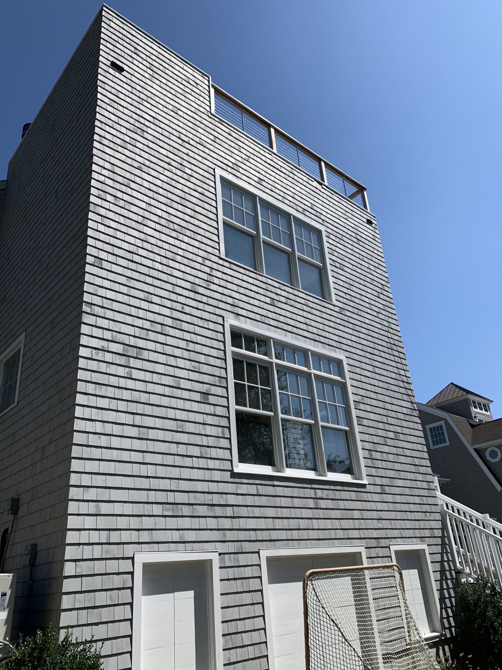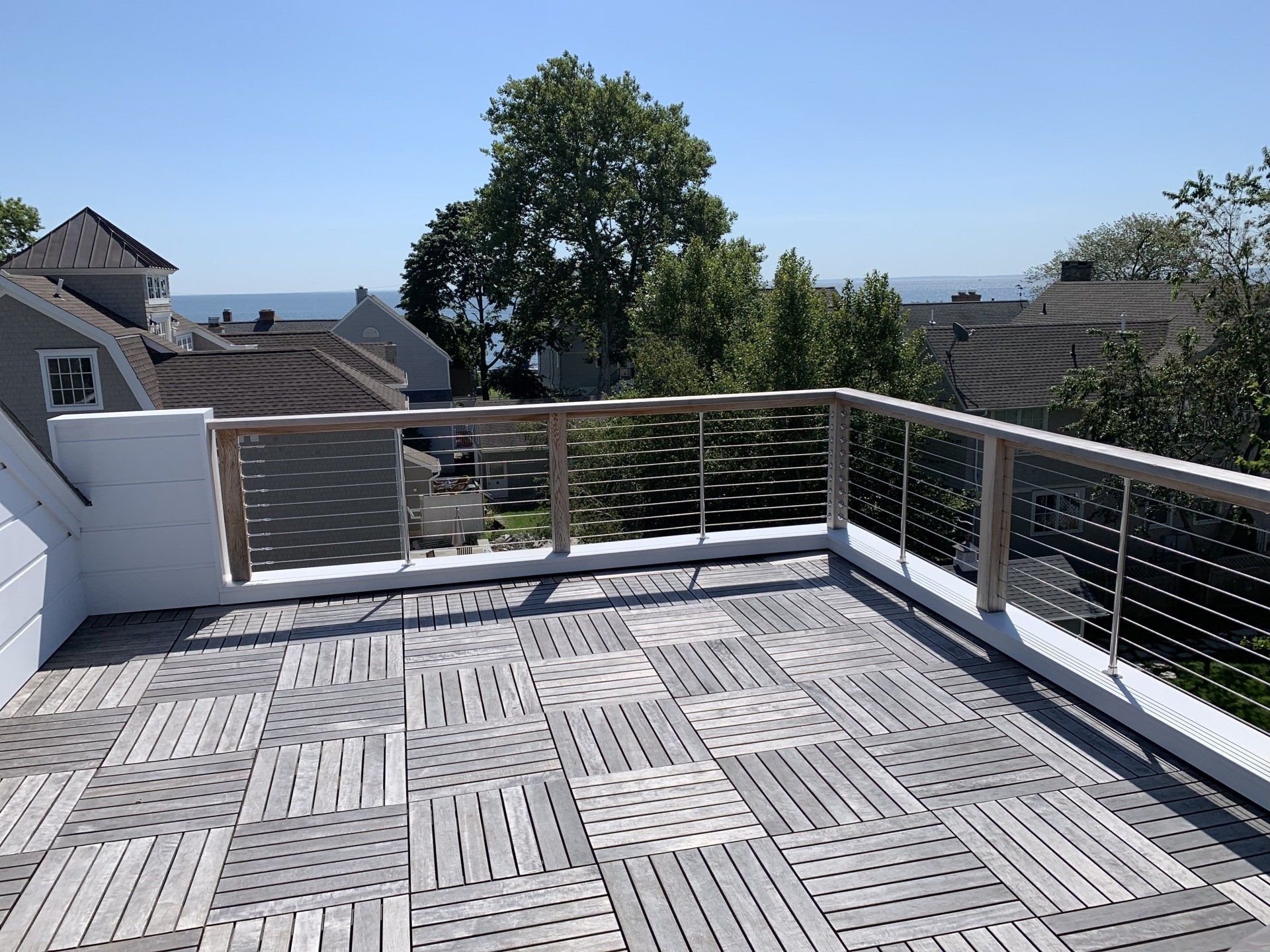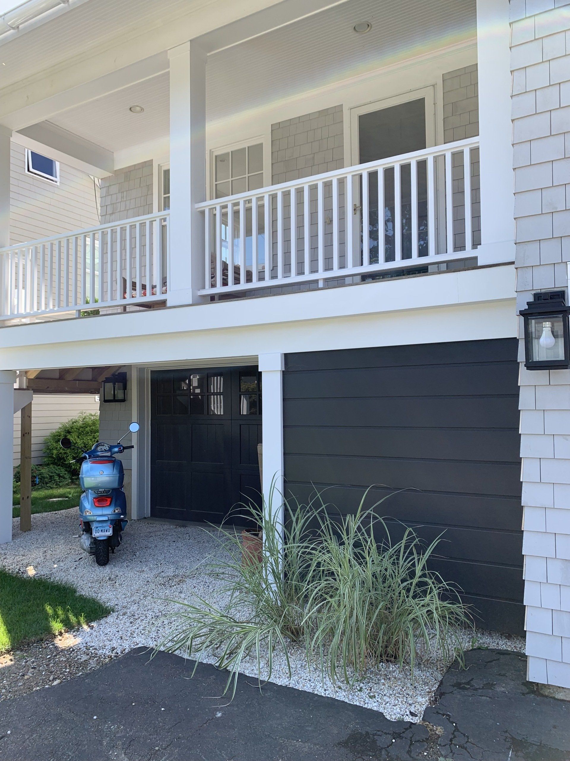 A modern, farmhouse-style addition that expands living space and creates a balcony terrace with a tree-top view.