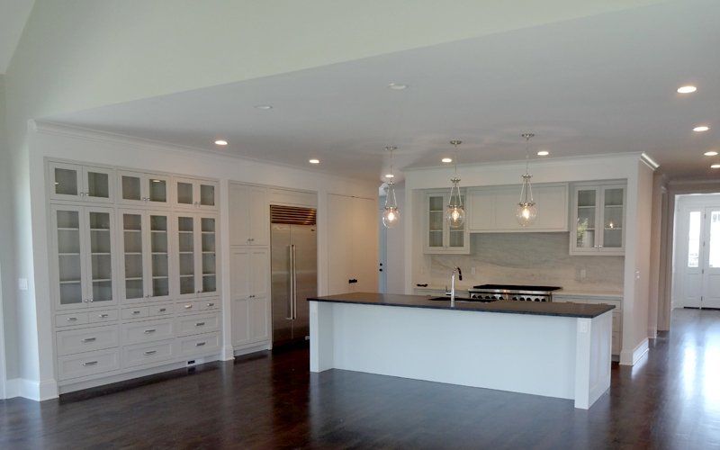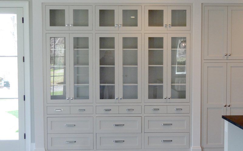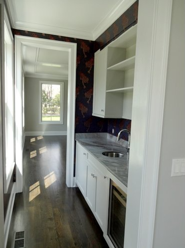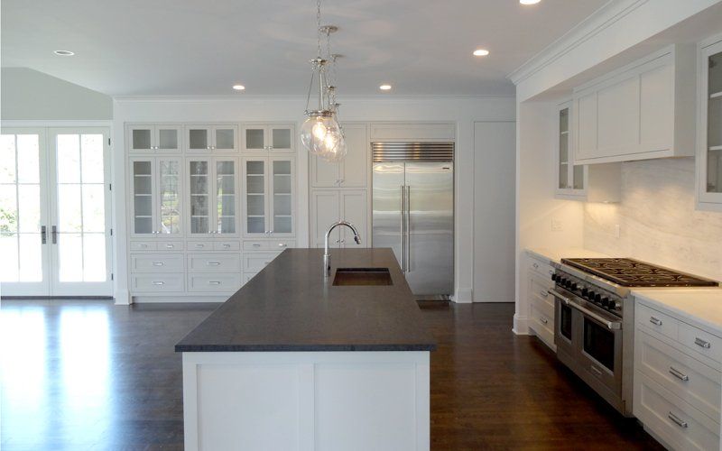The bright and spacious chef's kitchen includes a modern take on traditional farmhouse style built-in cabinetry.
